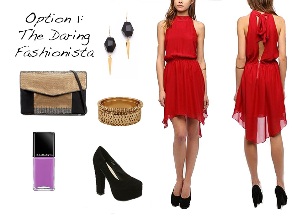 Since my previous post about the event I attended and what I wore, I have received several requests asking for me to create more special event worthy outfits. This first option above is for the “Daring Fashionista,” in other words, the girl who wants to have all eyes on her. This gorgeous red chiffon dress looks great on pretty much every skin color and compliments many hair colors as well!