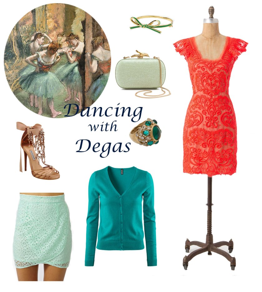 Last week, I was lucky enough to be able to have some time off to go to one of my favorite places in Los Angeles. Los Angeles County Museum of Art more commonly known as L.A.C.M.A. I know I may seem old fashioned, but one of my favorite things to do in my spare time is to view artwork. My favorite era is the French Impressionist and Edgar Degas definitely is on my list of top 5 favorite artists of all time. I have seen bits and pieces of his famous “dancers” before but never before like I saw them at L.A.C.M.A. The piece that stood out to me was a small group of ballerinas casually stretching together clad in bright green tutus. Seeing this piece for me up close and personal was like meeting my favorite celebrity. NOTHING COMPARES to seeing a brilliant work of art in the flesh (I know I’m a nerd). Below I created a collage that I feel embodies what today’s fashion would mean to the amazingly talented Edgar Degas.