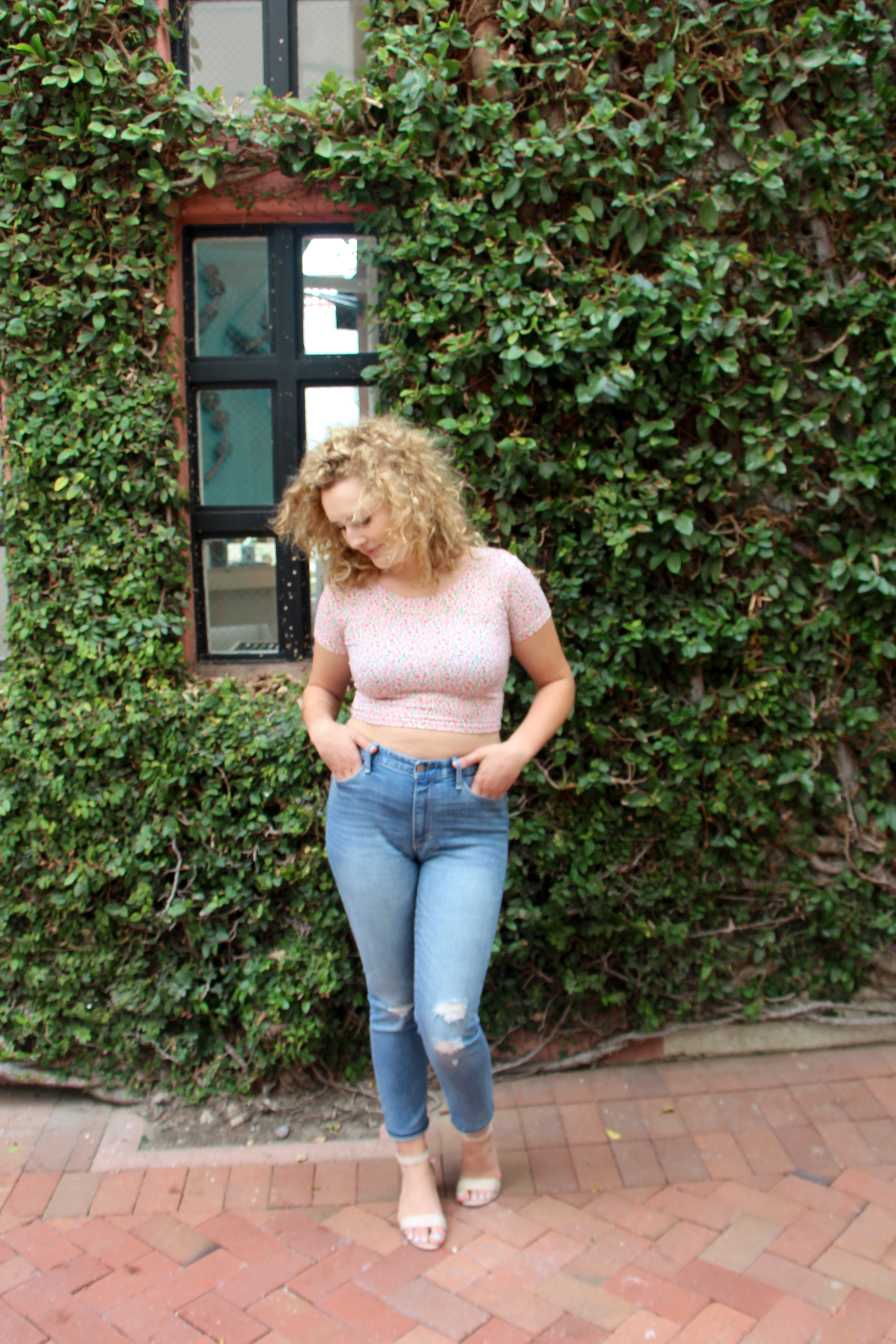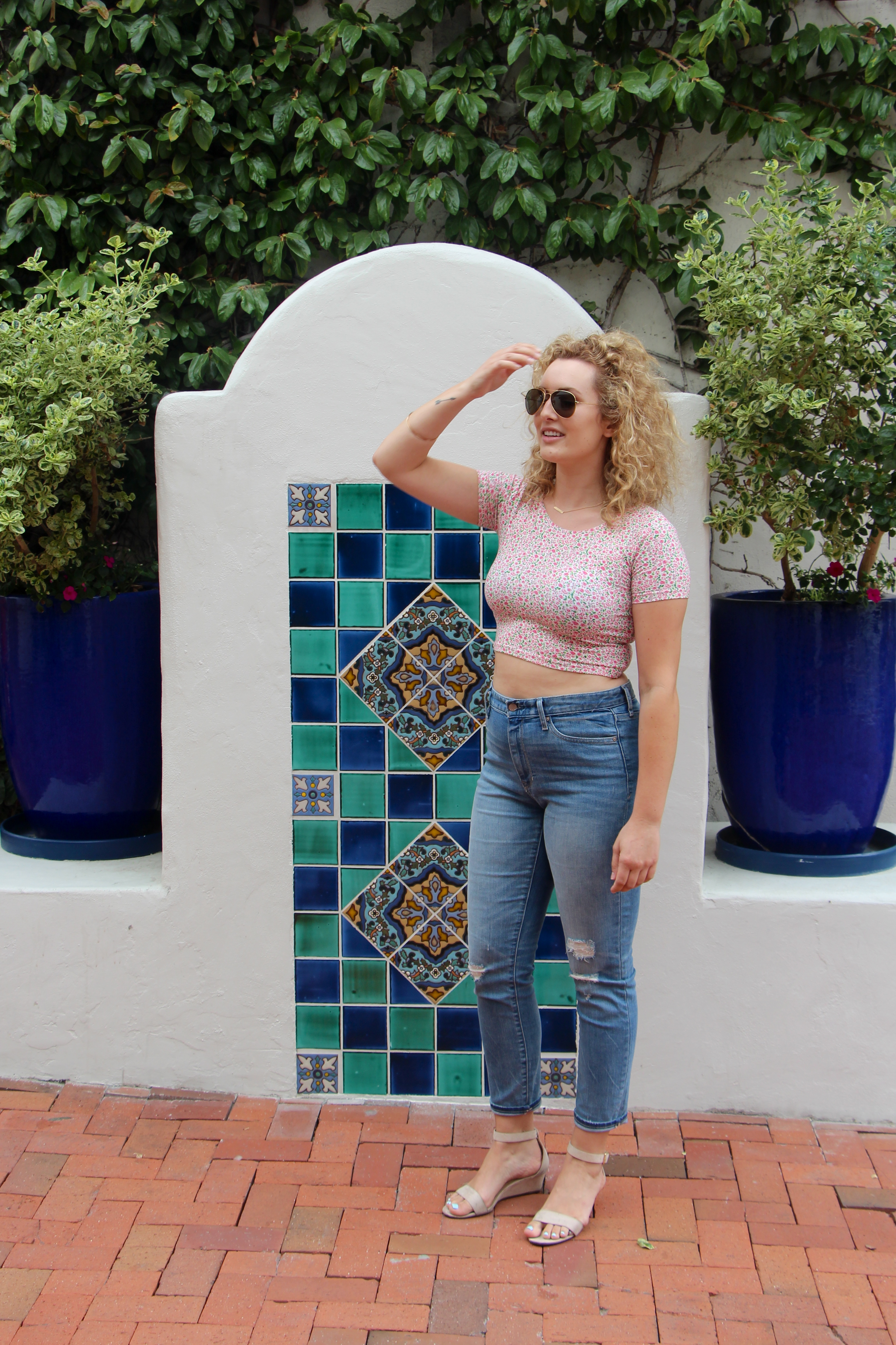 Earlier this week, my sister and I both had a day off so we decided to to take a trip up to Santa Barbara to shoot some photos and of course, do some shopping. I wore these high-rise Gap jeans I found on MAJOR sale about a week ago (and have worn them nearly everyday since). I decided to break out this floral American Apparel crop top that was part of last summer’s staple wardrobe in Europe. In the past, I’ve only worn this top with shorts and skirts, so it was fun to try something new and maybe a little more Carrie Bradshaw-esque. 😉